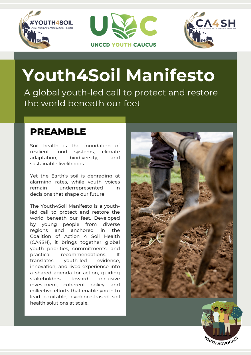 The Youth4Soil Manifesto is a youth-driven, shared framework for action on soil health. It brings together global youth priorities, practical recommendations, examples of youth-led action, and commitments toward a unified youth vision for 2050.